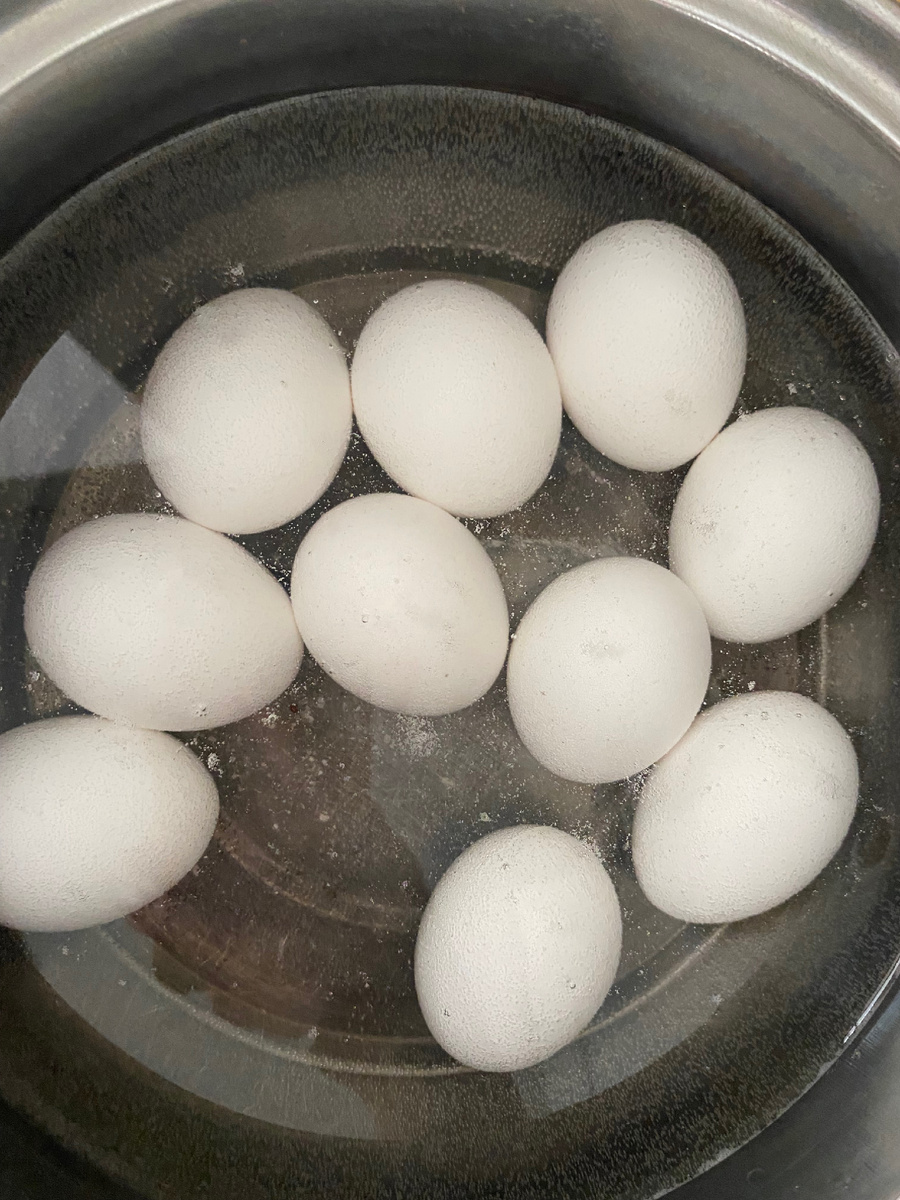 Не обошлось без нестандартных решений – был оформлен заказ с доставкой от популярного магазина. В процессе подготовки, сварено целое десяток яиц вместо запланированных шести. Одно яиццо, несмотря на то что его заранее довели до комнатной температуры и посолили, треснуло. Возможно, кто-то подскажет, как избежать этой проблемы в дальнейшем?